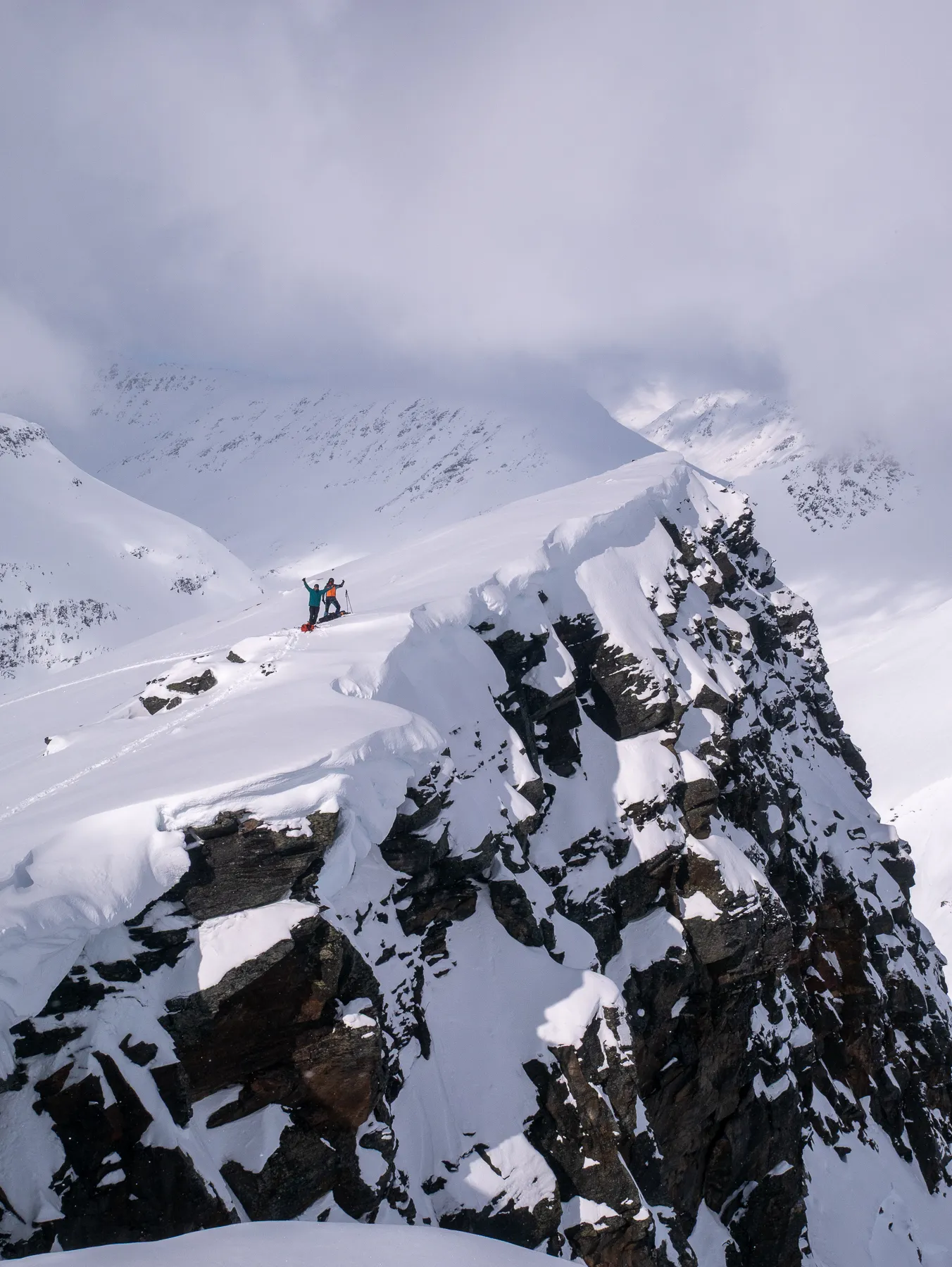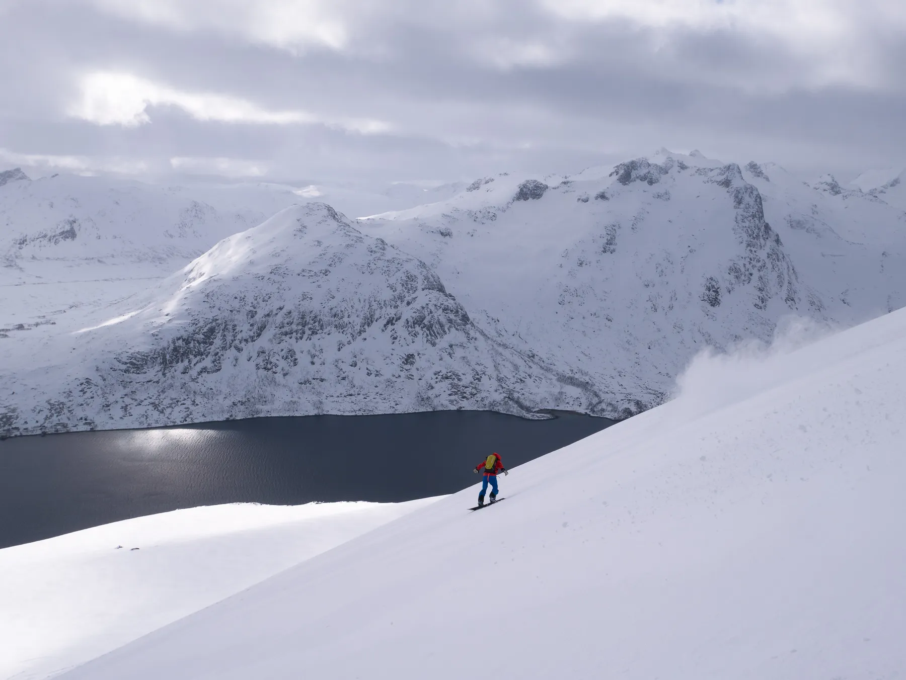 Seeing all those glaciers and crevasses packed in a deep layer of snow, the views are breathtaking. Fjords and boats flicker below like a disco ball. Total concentration before the drop into a tight chute.