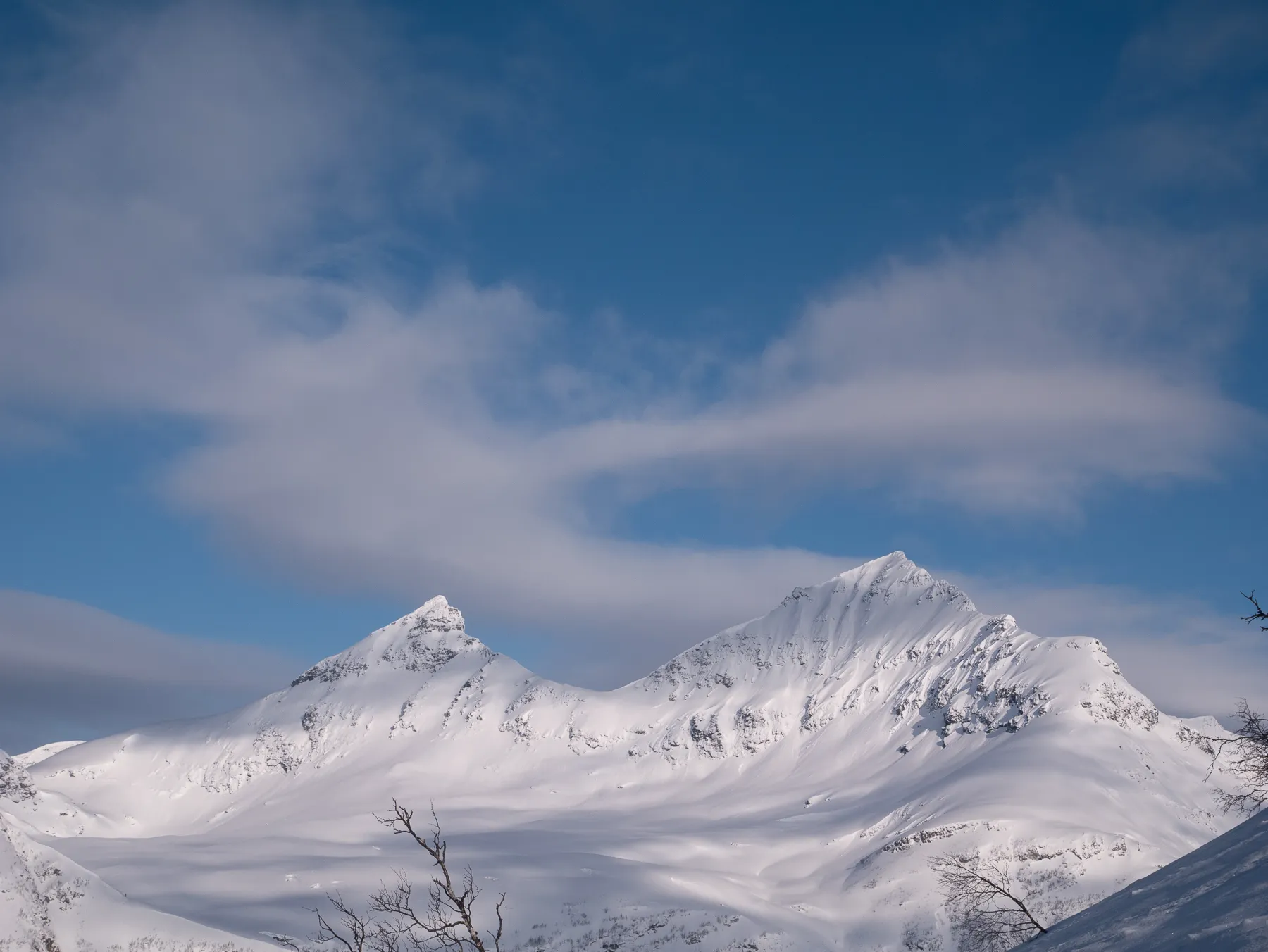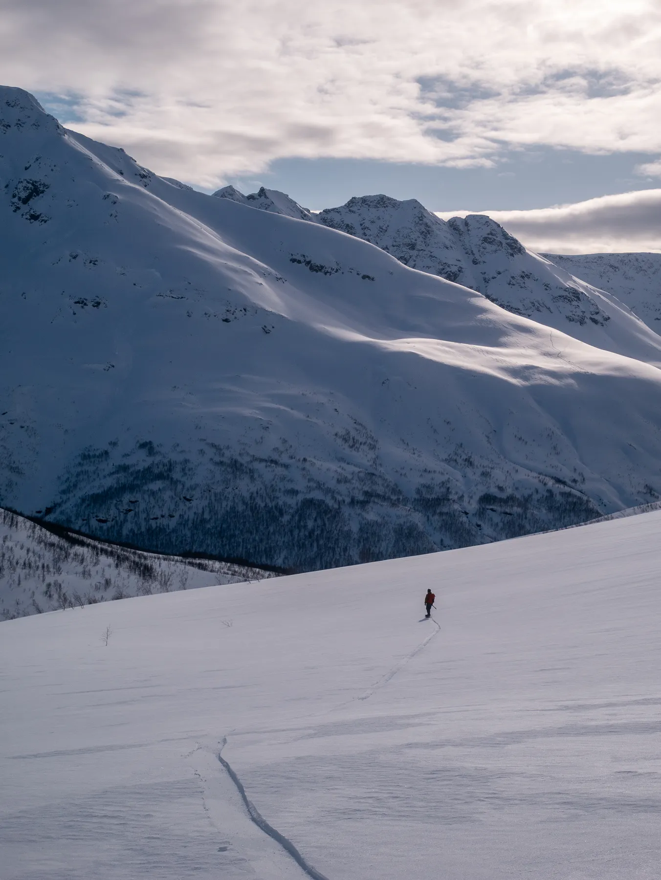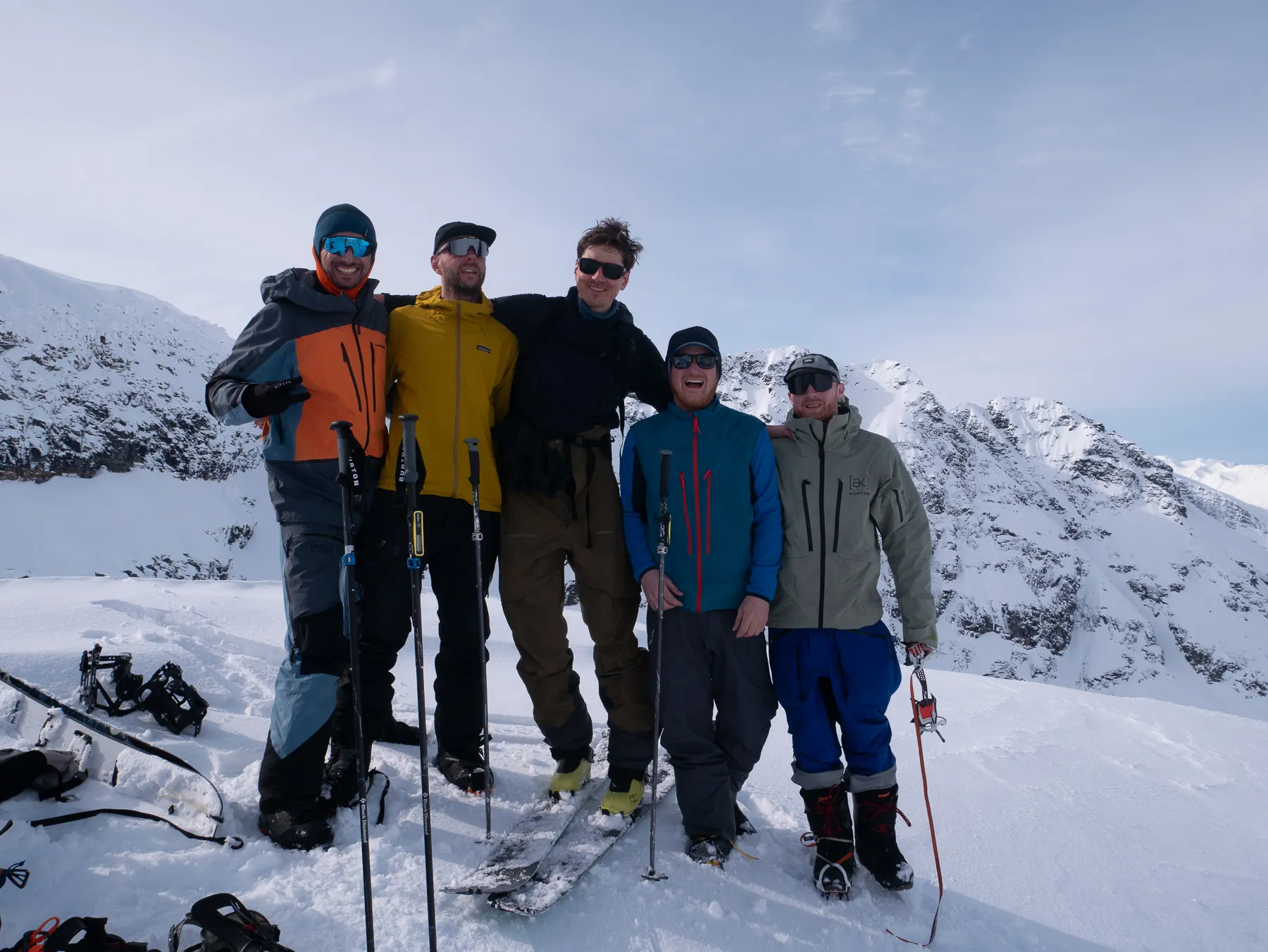We make a 5km skintrack through the valley, crossing rivers a few times before we even reach the base of our climb. Struggling through the birches, keeping those crampons ready for that shiny little spot, the summit slowly reveals herself.